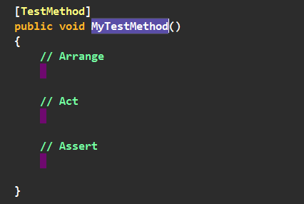 If you layout your tests as I do using the Arrange, Act, Assert structure then we still have to type this out each time. In order to save my valuable keystrokes I created my own snippet file that inserts the AAA structure as standard. Simply download the following XML file and save this file in the same folder as the standard Visual Studio snippets for tests. On my machine this is: